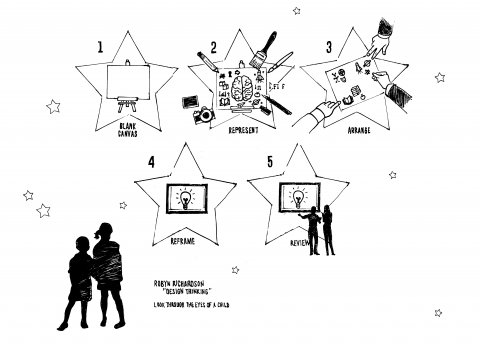 Viewing life through the eyes of a child is the foundation for musician Robyn Richardson's five-point plan for thought and idea creation. She concludes that as we get older, our viewpoint gets smaller and more focused until all we are left to communicate with is a metaphorical pencil. Children effortlessly express their thoughts with free abandon, using whatever medium is readily at hand, be it a crayon, pencil, paintbrush or clay (Richardson, 2014). We need to learn to look at life through the lens of a child (Waititi, 2015). Start with a blank canvas and your problem. Represent your chaotic thoughts on your canvas using any medium available from photographs to pencil sketches, collage or even clay. Take a step back and start to arrange your canvas. The human mind sees patterns quickly, and groups and correlations will begin to form. Reframe your arrangement or idea. Get another contrary view or perspective to review and affirm your concept (Richardson, 2014).